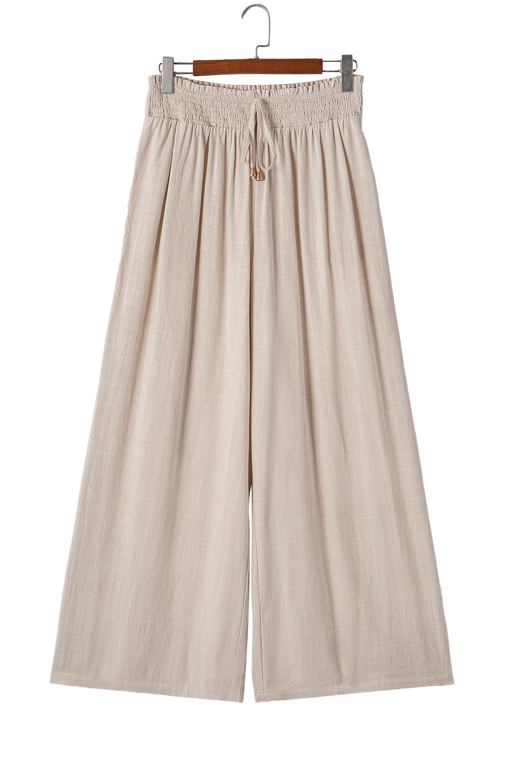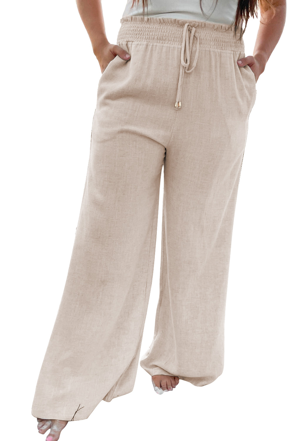 Elevate your casual look with these Plus Size Pants. The frill detailing adds a touch of femininity to the classic wide-leg design. Crafted from a comfortable fabric, these pants feature a smocked waist for a perfect fit. The relaxed wide-leg silhouette offers both style and comfort for all-day wear. With convenient pockets for added functionality, these pants are versatile for various occasions, from running errands to a casual dinner out. The neutral beige color makes these pants easy to style with different tops and accessories, adding versatility to your wardrobe.